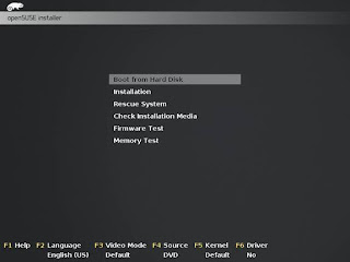 * Booting from CD/DVD drive or USB-Stick for installation, or support for booting over network (you need to setup PXE by yourself, look also at PXE boot installation) or an existing installation of openSUSE, more information at Installation without CD